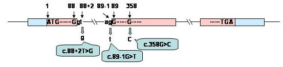 これもイントロンに塩基置換がある場合の記載法です。89-1とは89番目で始まるエクソンがあった場合、そこから5’側に数えて1番目の塩基(イントロンの最後の塩基)を表します。従って89-1を88と書いてはいけません。そうすると前のエクソンの最後の塩基になってしまいますから(下図参照)。
